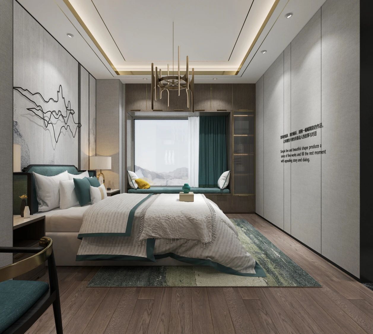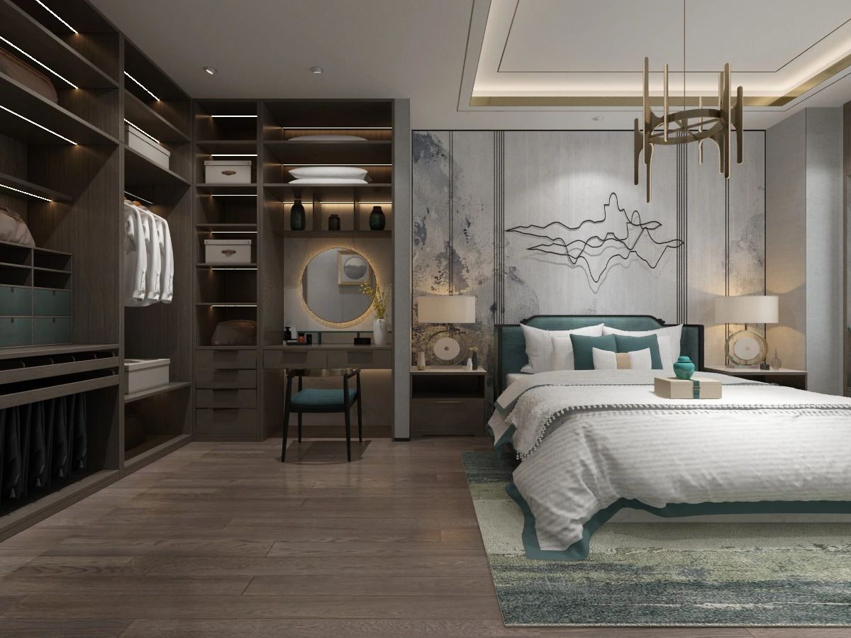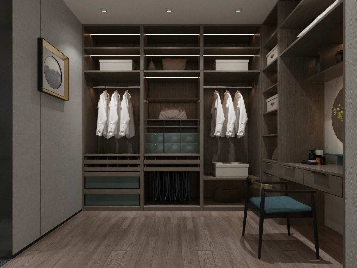 卧室及衣帽间依然是中式感十足,简单的陈设似有现代东方意境。室内色彩的深与浅,交汇出节奏,使空间立即轻快起来。