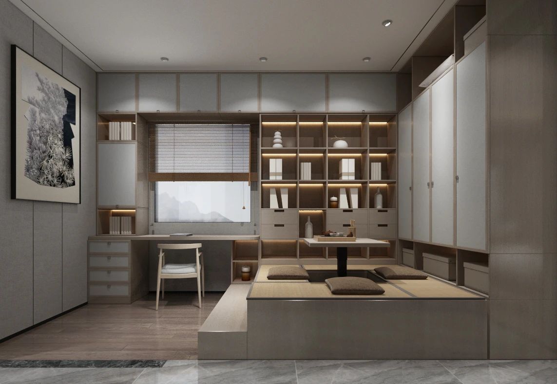 客卧沿用厨房的装修风格,客卧选择的是榻榻米的设计,收纳功能强大的榻榻米解决了业主很多的收纳问题。