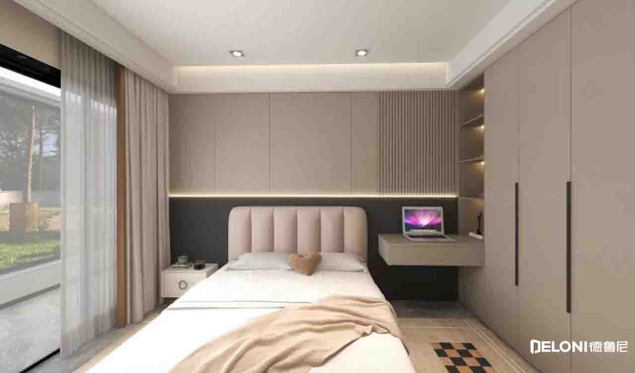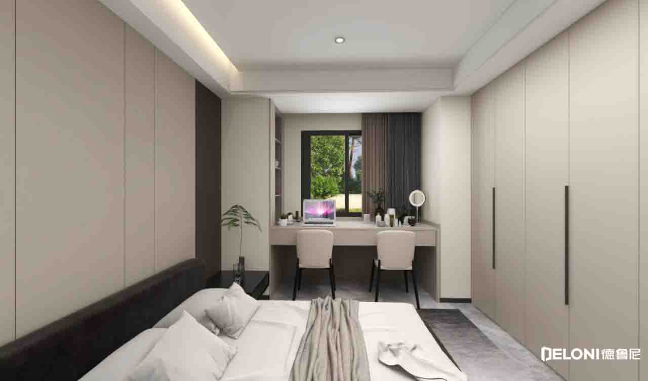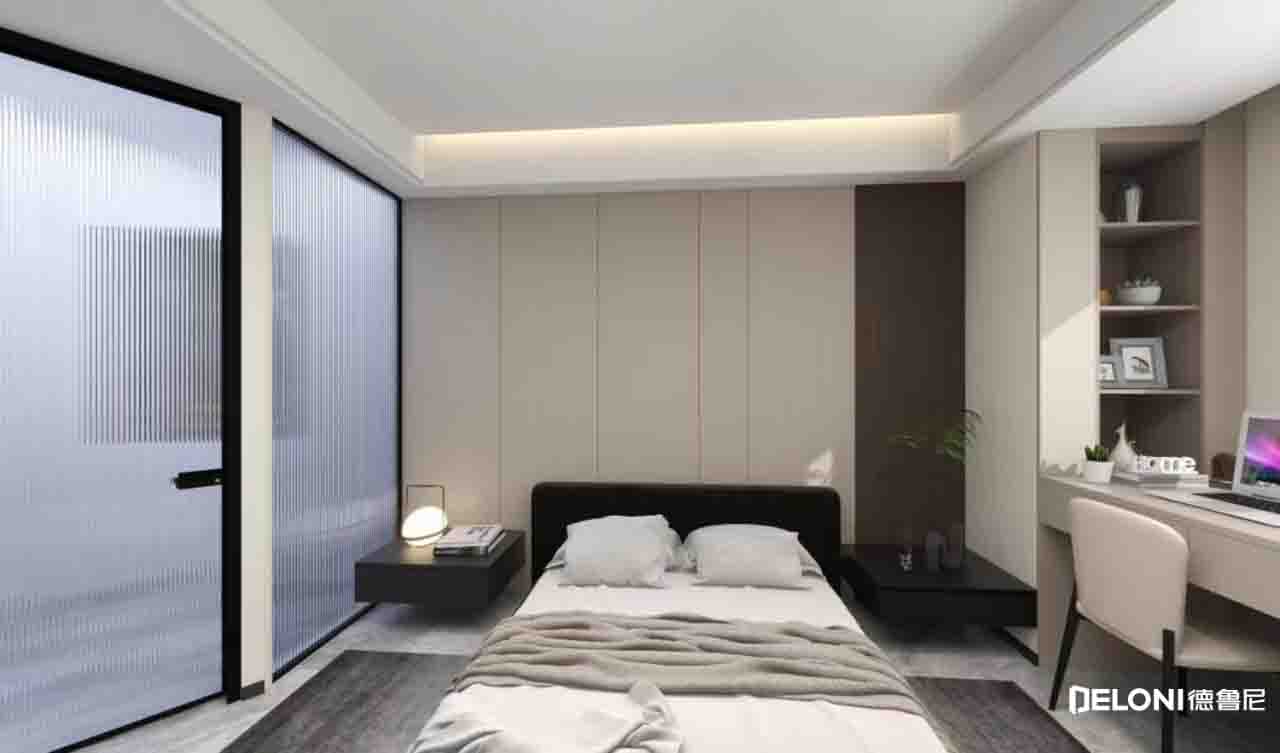 感知极致优雅- 空间的软装家居在色彩上,采用了大量的中性色,稍稍点缀一点冷调的黑,生机盎然的鲜花于细节处延续低调与质感。这些颜色能在瞬间提升空间的氛围感,带来家庭生活的温度。 整墙艺境白露的电视柜,在黑灰的沉稳色调下配以暖调的灯光,尽显稳重气韵。光线充盈空间氛围,或宁静之书香气质,或典雅之轻闻浅嗅。 高级灰的床品和地毯,散发出软绵绵的质感,营造朦胧的睡意。床边的工作区极其简易,壁挂式的小书桌和精致的头灯,满足居者日常的阅读需求。 主卧实现了美学与功能的统一。清砂古绒的衣柜及清砂行墨护墙,内敛随性的纹理让空间更显细腻高级。用色彩做出视觉反差,白天可以感受到空间的张弛有度,夜晚可以沉浸在惬意的环境中。在这里,温暖、纯粹、舒适的氛围基调得以彰显。 贴合少女自身散发的温雅、柔软气质。女孩房以一抹藕粉色为基调,加以心爱之物点缀着简洁的空间。每一面都打造出了不同的美感,柔美中依然保持着纯真与个性。 主案设计师