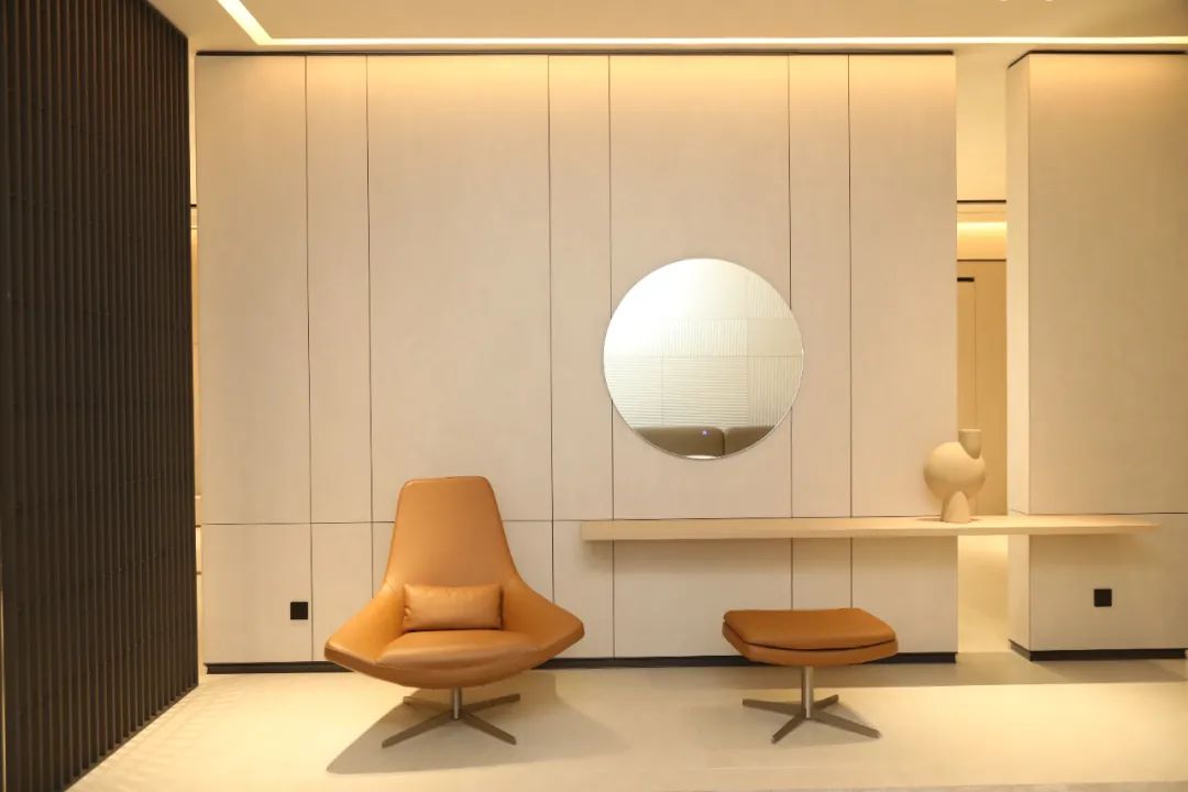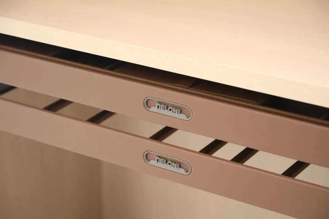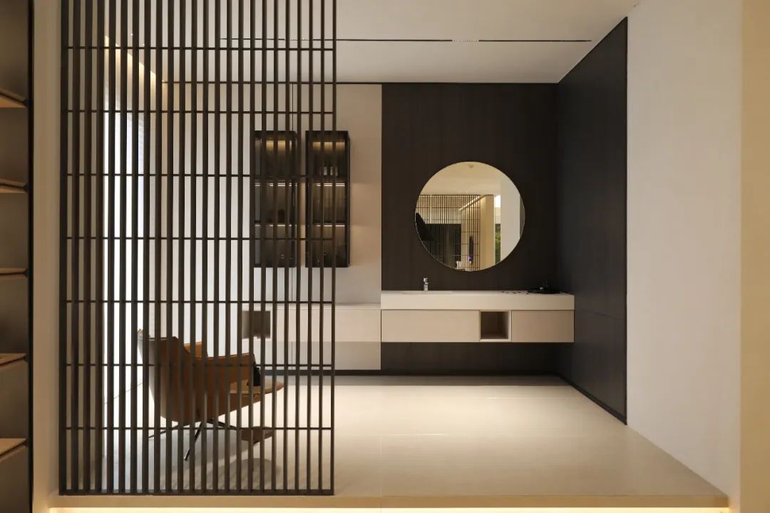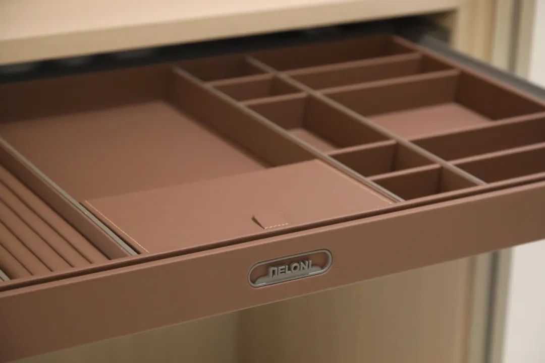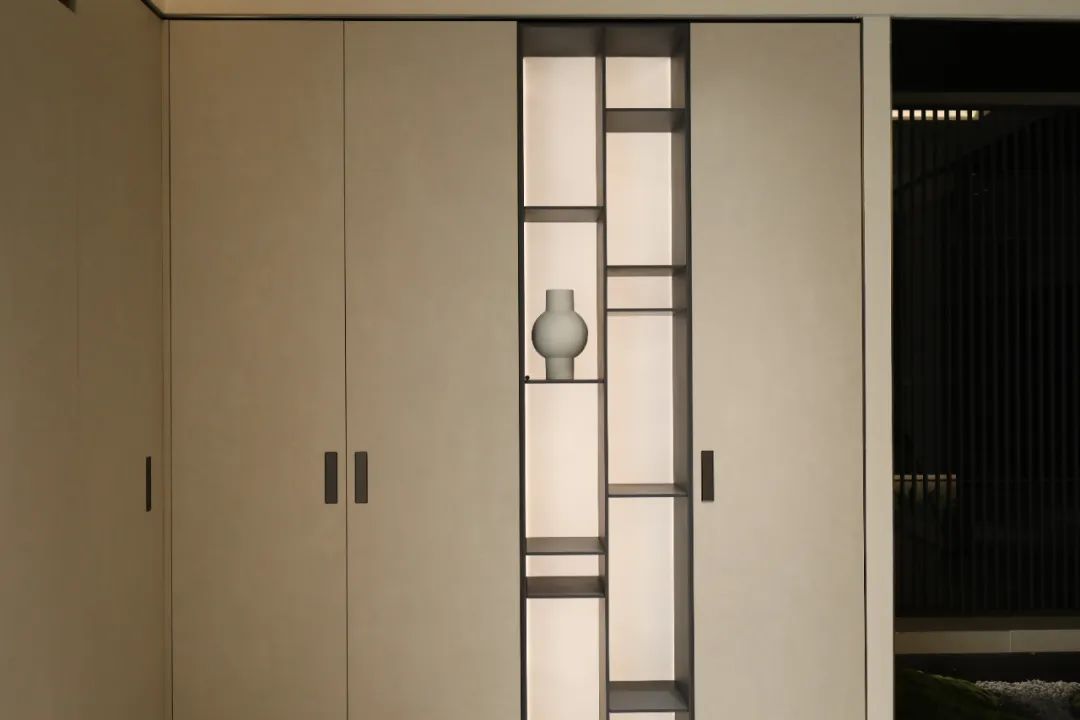 人性化的包裹式设计,点滴中都透出德鲁尼对于家的呵护,从衣橱到首饰的收纳,从45度内斜角开放柜到翻转式内扣手,每一个细节都深思熟虑,让功能美学在多元素的结合中散发出“素而丰,淡却雅”的空间感受。